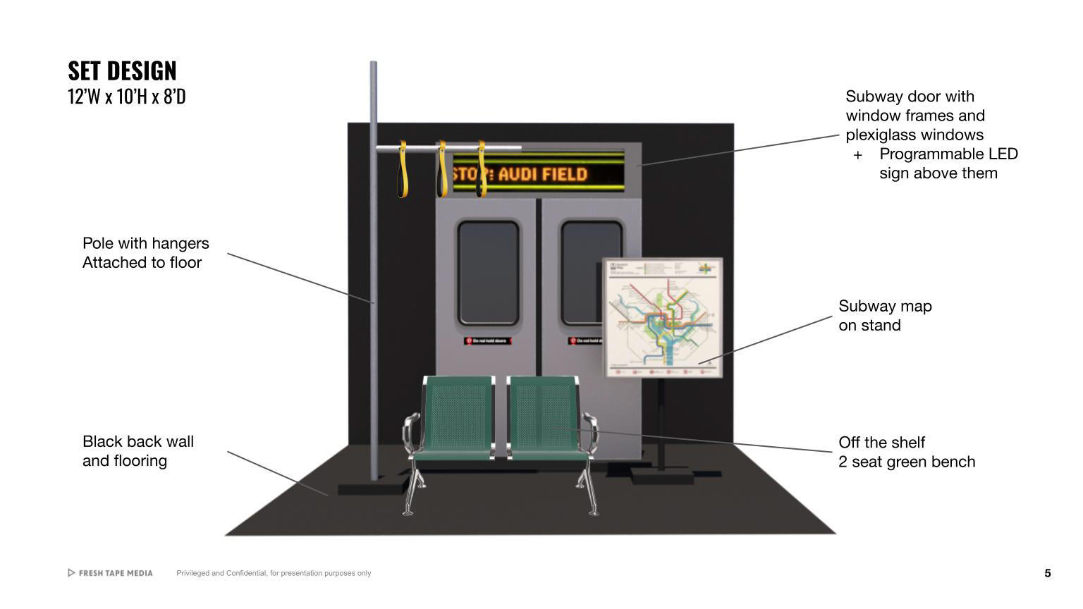 For the Washington Spirit Media Day 2026, I designed a photo station inspired by the team’s journey to Audi Field. The concept reimagines a subway stop along the players’ route to the stadium, translating the energy of match day into an abstract, deconstructed environment. Developed the concept, produced set design, technical drawings and presentation design, and coordinated with fabrication vendors to guide production and ensure the set was built according to the design intent.